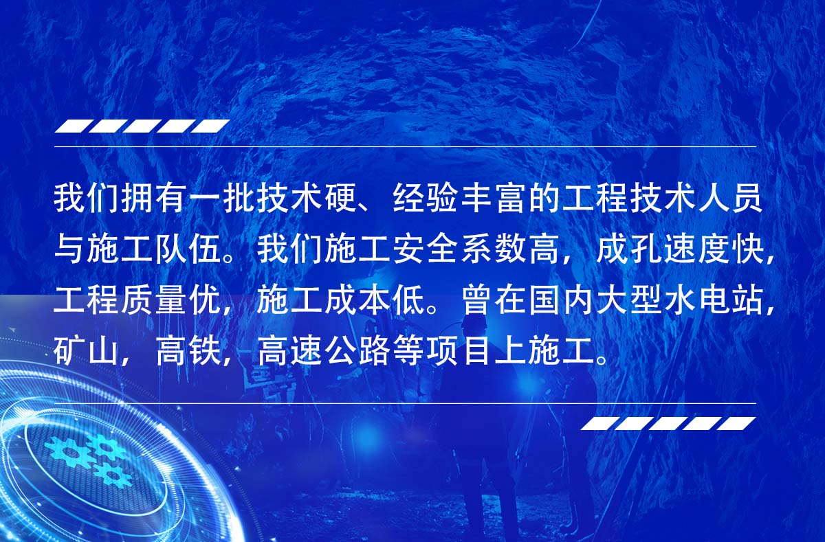 淮北市勤拓礦山工程有限公司是一家從事多年反井鉆機施工的服務生產(chǎn)型公司,公司目前有十幾臺鉆機設備,ZFY120/30/150型反井(天井)鉆機5臺,ZFY1.8/40/250型反井(天井)鉆機4臺,ZFY2.5/70/200型反井(天井)鉆機2臺,ZFY3.0/120/400型反井鉆機1臺,ZFY3.5/120/400型反井(天井)鉆機1臺,可承接深度0-300米,成孔直,0.9~4米.1.2~3米的各種豎井、井下煤倉、溜煤眼、通風井、調(diào)壓井、電纜井、泄水井等。我們擁有一批技術硬、經(jīng)驗豐富的工程技術人員與施工隊伍。我們施工安全系數(shù)高,成孔速度快,工程質(zhì)量優(yōu),施工成本低。曾在國內(nèi)大型水電站,礦山,高鐵,高速公路等項目上施工。